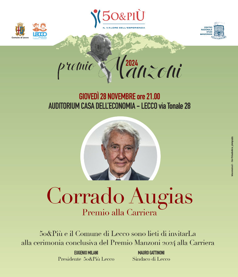 LECCO, 6 NOVEMBRE 2024 – Sarà assegnato a Corrado Augias il Premio Letterario Internazionale Alessandro Manzoni Città di Lecco alla Carriera 2024 organizzato da 50&Più Lecco. Il giornalista e scrittore nato a Roma nel gennaio 1936 è conosciuto e apprezzato anche come autore e conduttore televisivo. Per anni collaboratore di Repubblica, Augias vanta una lunga esperienza in Rai con programmi come “Telefono Giallo”, “Enigma”, “Storie vere”, “Città segrete” “Rebus”…: attualmente lavora per La7 dove conduce la trasmissione “La Torre di Babele”.
