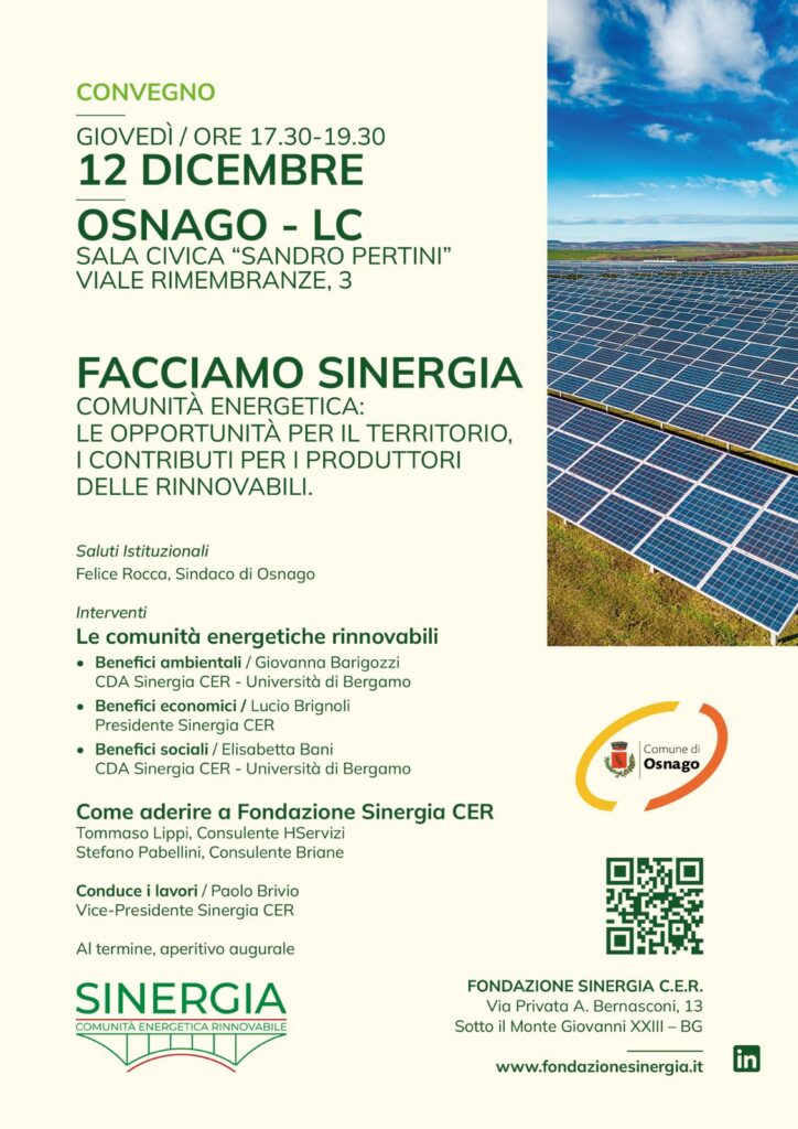 È inoltre stato attivato il sito internet (fondazionesinergia.it), che oltre a contenere le informazioni essenziali sulla Cer, consente di seguire una procedura di adesione semplificata.Dopo l’intenso lavoro di avviamento, per Sinergia è venuta l’ora della presentazione pubblica, grazie a un convegno che avrà luogo nel pomeriggio di giovedì 12 dicembre nella sala civica “Sandro Pertini” del Comune di Osnago (programma in locandina). I responsabili dell’organismo illustreranno obiettivi e metodi di lavoro di Sinergia, e soprattutto le opportunità che essa offre, a soggetti pubblici e privati, sui molteplici fronti della transizione energetica, della tutela ambientale, dell’inclusione e coesione sociale, senza trascurare i benefici economici che deriveranno a coloro che decideranno di aderire alla Cer, in qualità di produttori e/o consumatori di energia rinnovabile
