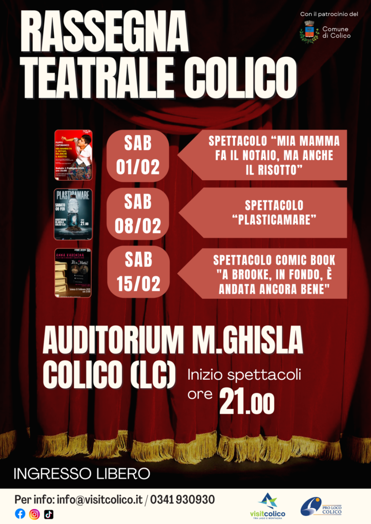 Nel mese di febbraio, invece, avrà luogo la rassegna teatrale di Colico. Tre sabati, tre spettacoli per un viaggio affascinante attraverso le diverse sfaccettature del teatro contemporaneo. La rassegna, che si terrà sempre presso l’Auditorium M.Ghisla, offrirà al pubblico l’opportunità di confrontarsi con tematiche attuali, dalla GenZ, all’inquinamento, ai classici rivisitati in chiave moderna. Primo appuntamento in programma sabato 1° febbraio con lo spettacolo “Mia mamma fa il notaio, ma anche il risotto” di Filippo Capobianco, uno spettacolo che combina i linguaggi della poesia performativa e del teatro canzone per raccontare una favola di formazione che tratta i rapporti familiari e le dinamiche generazionali. Sabato 8 febbraio andrà in scena lo spettacolo “Plasticamare” prodotto da Teatro in Mostra, uno spettacolo sulla tematica green che rispolvera un classico della letteratura di Hemingway, dalla rilettura de “Il vecchio e il mare” facendo riemergere il sacro rapporto tra uomo e natura. Infine, sabato 15 febbraio verrà proposto un comic book teatrale con “A Brooke, in fondo, è andata ancora bene” di Alberto Corba. Tutti gli spettacoli avranno inizio alle ore 21.00 e l’ingresso sarà libero e gratuito per tutti.