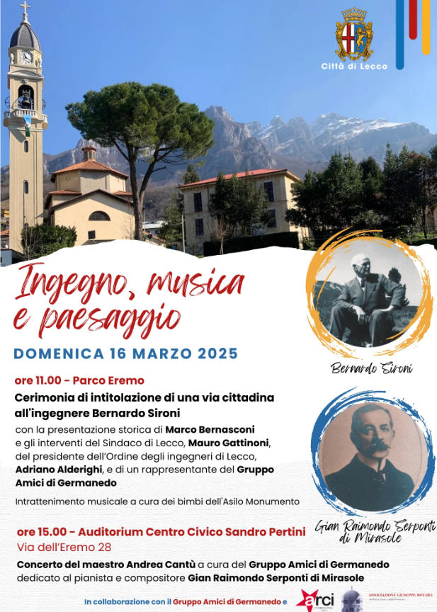 LECCO, 15 MARZO 2025 – Il Comune di Lecco, in collaborazione con il gruppo Amici di Germanedo, il circolo Promessi Sposi e l’associazione Giuseppe Bovara – Archivi di Lecco e della Provincia, organizza per domenica 16 marzo la giornata-evento “Ingegno, musica e paesaggio”, dedicata a due importanti personaggi legati al territorio di Lecco, l’ingegnere Bernardo Sironi e il pianista e compositore Gian Raimondo Serponti di Mirasole.