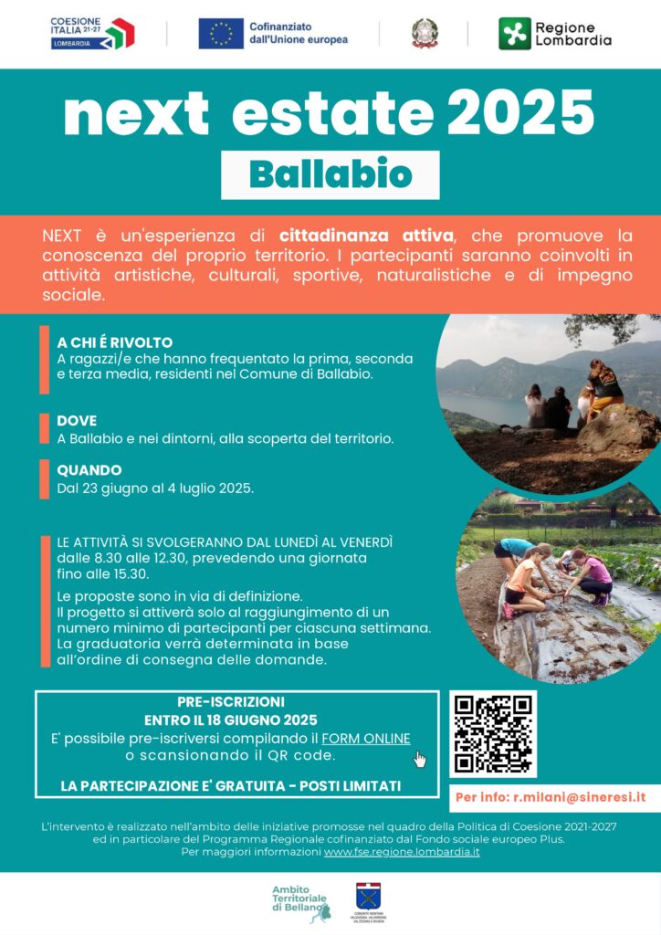 “Lo scorso anno i ragazzi che parteciparono al progetto Next furono molto contenti e soddisfatti – dichiarano il Sindaco Giovanni Bruno Bussola e l’Assessore alle Politiche Sociali Paola Crotta – ecco perché ci siamo attivati per reperire fondi Ministeriali e Regionali tramite la CM della Valsassina- Ambito territoriale di Bellano Servizi alla Persona, al fine di offrire il servizio in modo gratuito per le famiglie di Ballabio. Siamo certi che, soprattutto grazie all’ottima organizzazione, come sempre, della Coop. Sineresi, i nostri ragazzi potranno trascorrere in compagnia delle splendide giornate e allo stesso tempo sentirsi cittadini attive del loro Paese”.