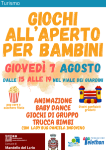 MANDELLO DEL LARIO, 5 AGOSTO 2025 – Giovedì 7 agosto, dalle ore 15:00 alle 19:00, il viale dei Giardini si trasformerà in una grande area di gioco e allegria dedicata ai più piccoli. Tra le varie attività in programma ci saranno baby dance, giochi di gruppo, il trucca bimbi con Daniela Indovino alias “lady bug”, oltre a due giochi gonfiabili per tanto divertimento all’aria aperta.