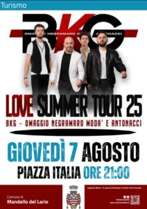 In serata l’estate musicale di Mandello del Lario prosegue con un nuovo appuntamento ad ingresso libero da non perdere. Giovedì 7 agosto alle ore 21:00, piazza Italia ospiterà il concerto del gruppo BKG, organizzato dal Comune di Mandello del Lario, che proporrà un omaggio speciale ai grandi protagonisti della musica italiana.