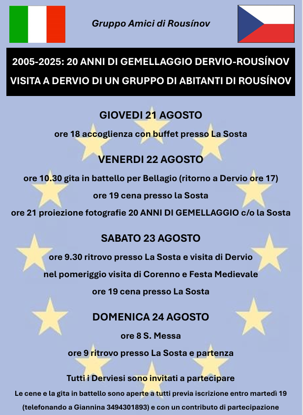 La delegazione di Rousínov, formata da 15 persone tra cui anche il sindaco del Comune ceco, arriverà a Dervio giovedì 21 agosto nel tardo pomeriggio, e sarà accolta presso il centro ‘La Sosta’ con una cena conviviale preparata dalle famiglie ospitanti. Come in tante occasioni del passato, gli abitanti di Rousínov verranno infatti ospitati nelle case di alcuni Derviesi, resesi disponibili rispondendo a un appello diffuso qualche tempo fa a tutta la popolazione.