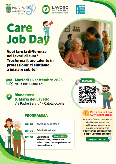 CALOLZIOCORTE, 27 AGOSTO 2025 – Martedì 16 settembre dalle 8.30 alle 12.30, al Monastero di Santa Maria del Lavello di Calolziocorte, si terrà la seconda edizione dell’iniziativa Care Job Day, finalizzata a favorire l’incontro tra le realtà del territorio operanti nel settore di cura e le persone disoccupate o in cerca di una nuova opportunità lavorativa.