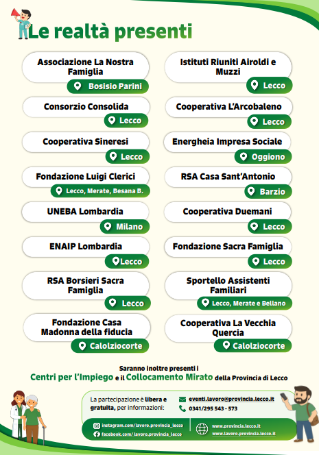 All’interno del Job Day sarà organizzato il momento formativo Riconoscere, raccontare, valorizzare: le competenze nel lavoro di cura a cura degli operatori del Centro per l’impiego – Servizio Centro risorse donne della Provincia di Lecco, in collaborazione con enti di formazione professionale del territorio.