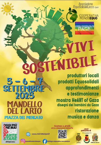 MANDELLO DEL LARIO, 31 AGOSTO 2025 – A Mandello arriva il Festival Vivi Sostenibile, la festa annuale della Cooperativa Mondo Equo e dell’Associazione Equosolidale Lecco ODV. L’iniziativa gode del patrocinio dei comuni di Lecco, Calolziocorte e Mandello del Lario, comuni nei quali si trovano le botteghe del commercio equo e solidale della cooperativa.Quest’anno si terrà i giorni 5-6-7 settembre, in Piazza Mercato a Mandello del Lario.